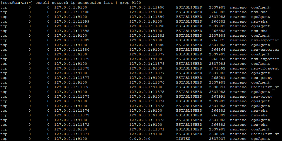 Afterwards, I wanted to verify what communication would use TCP/9100 and also find what services are using that port. It turns out, a lot of very important services -e.g., nsx-opsAgent, nsx-cfgagemt, nsx-sha, nsx-exporter- are using this port. The reason the port is not mentioned on port.vmware.com is that it only listens on localhost (127.0.0.1) but still, apparently, it’s very critical for NSX to function.