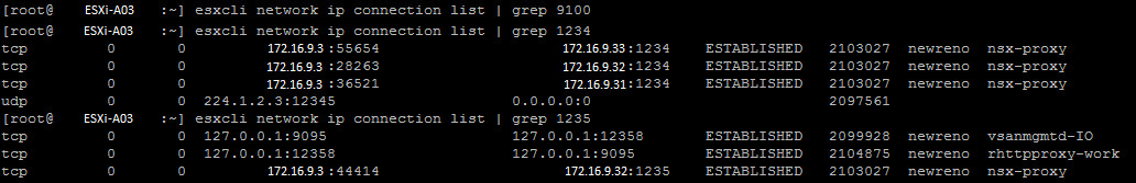 That is very interesting, which service uses TCP/9100? I know some old HP JetDirect printers used to use that port, but nothing for NSX comes to mind. So, off to ports.vmware.com to verify! A quick search within the NSX products shows that there is no match found on TCP port 9100. On a failed ESXi node (A03), there is no service listening on port 9100. However, on the default ports -TCP/1234 and TCP/1235- there are NSX services running for messaging between managers and nodes.