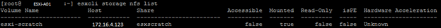 Now comes the hard part, remounting the NFS location, it’s tricky to do a remount of an NFS location on an ESXi node. Normally, one would unmount the NFS in vCenter and then mount it again. However, since this NFS mount is configured as the scratch partition, an error pops up that the location is still in use and therefore cannot be unmounted. Now with the ESXi node in maintenance mode, it was better to perform a complete reboot of the node which completely resolved the issues. After that, the scratch partition was mounted successfully and the NSX-opsAgent started. Also, the ESXi node now had a green status in NSX and vMotions were possible again.