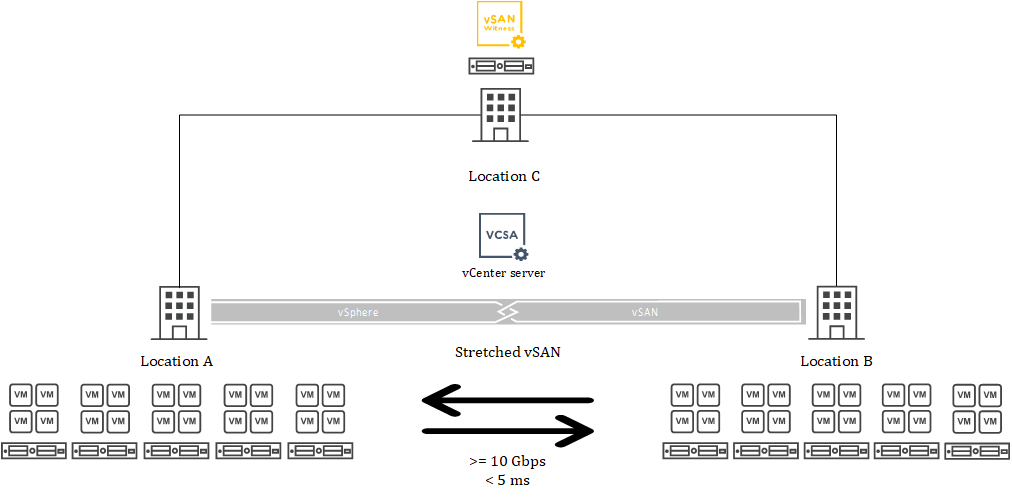 This situation happened in a VMware Hyper-Converged Infrastructure (HCI) that has a total of ten ESXi vSAN nodes version 7.0U3. There are two main locations (A and B) for hosting services, and there is a stretched vSAN datastore. Also, there is a third location (C) that hosts the required vSAN Witness. I myself like to think in images, and that is why the High-Level Design of the infrastructure is shown below.