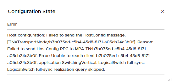 Luckily, the NSX UI offers the possibility to try to resolve the failed configuration state. That was the first thing to try of course and I hope for a more informative message than vCenter. Sadly the error didn’t give that much information either […] Failed to send HostConfig RPC to MPA […] and Unable to reach client […] full-sync realization query skipped […].