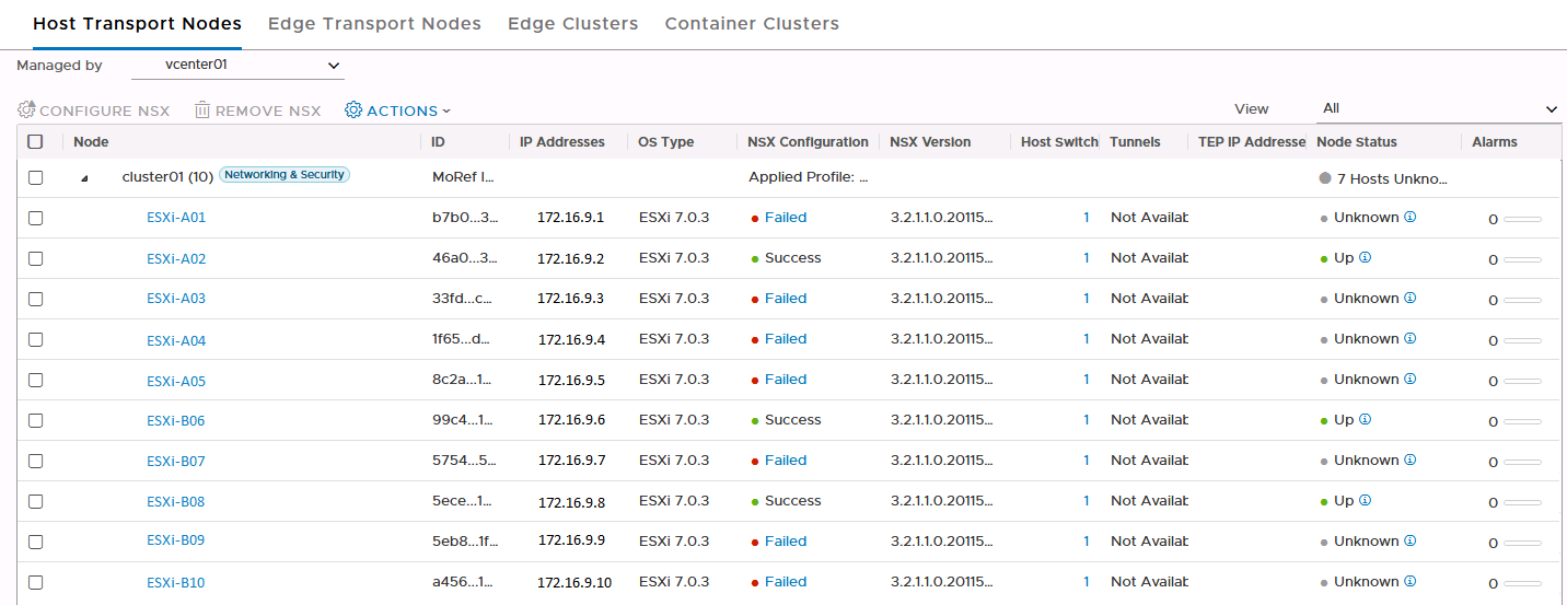 In this infrastructure, VMware NSX is being used for distributed firewalling. This error led me to believe the issue might be with NSX, while performing a vMotion, a change is required on the data plane of the network because the traffic now needs to be tunneled to another ESXi node. With that information, it was time to have a look at the NSX manager UI. The first thing I noticed was that there are absolutely no alarms popping up while logging in. This I found so interesting that I even contacted a colleague in most infrastructures I log in, there are usually at least a few alarms welcoming me. After that, I continued, and I came to the screen with the Host Transport Nodes. Here I saw that many nodes that have issues with communication to the control plane. This was easily visible because only three out of ten nodes had a green status with meant that they were able to successfully apply the NSX configuration.