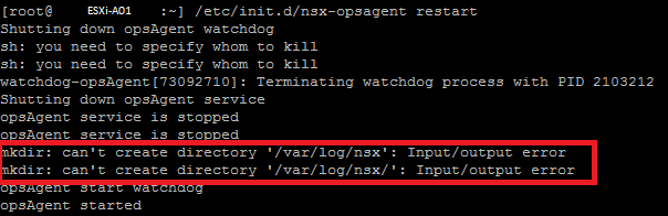 With the ESXi node in maintenance mode, the first step in trying to resolve the issue was to restart the nsx-opsAgent service. The output is shown below.