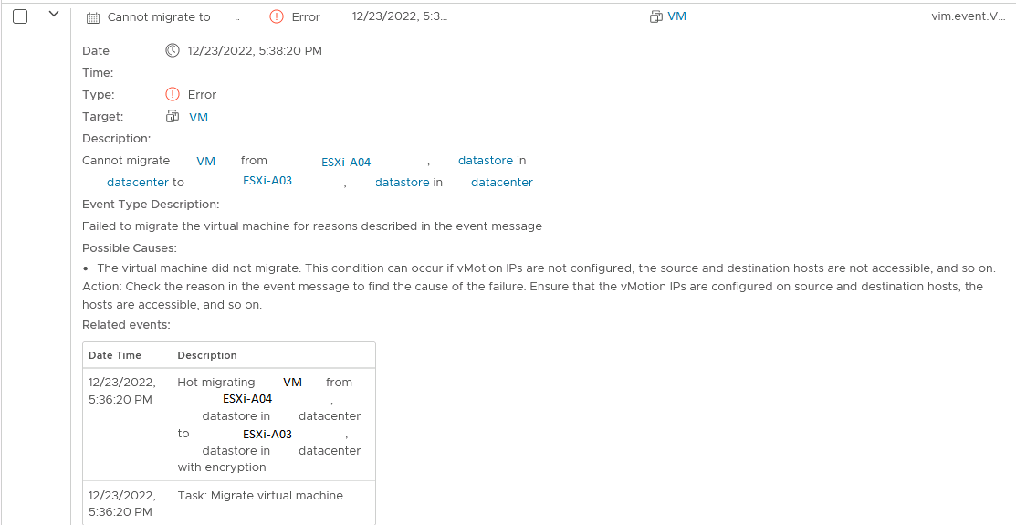 The issue is quite clear: no vMotions are possible at this point. Every time a vMotion is scheduled -it doesn’t matter whether manual or via DRS- it comes back with an error message as shown below. The first thing to notice is that there are roughly 200 VMs hosted on the infrastructure, and they are causing many errors as DRS is trying to balance the cluster. The first step in troubleshooting was to stop VMware from polluting the logs and set DRS on the cluster to manual. After manually trying to vMotion a VM, it showed an error that is shown below and it states: Failed to migrate the virtual machine for reasons described in the event message. Well, that’s not that much information to work from, so let’s check the event message: […] can occur if vMotions IPs are not configured, the source and destination host are not accessible and so on. […]. Also not that informative, thanks vCenter!