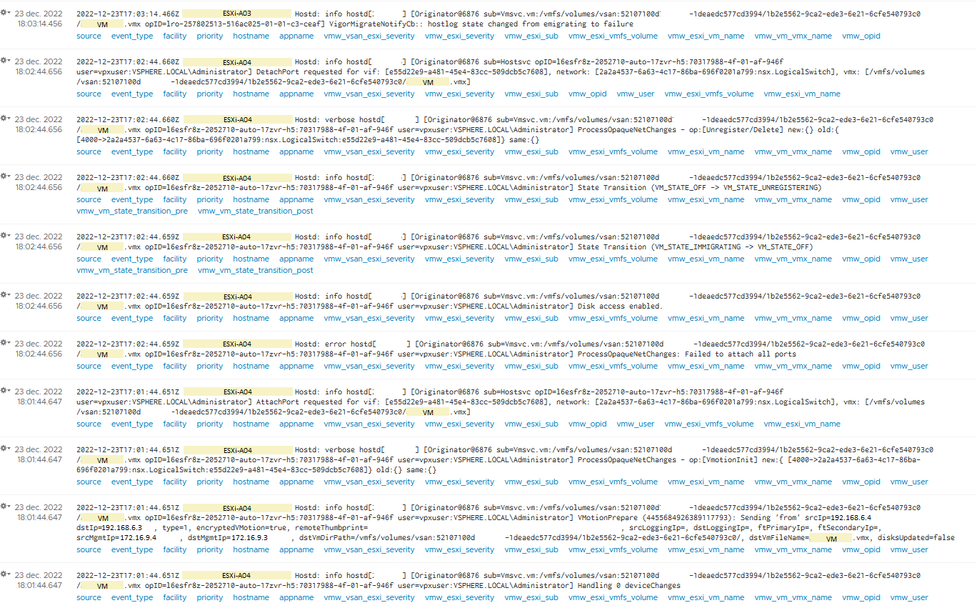 Luckily, there is a VMware vRealize Log Insight (vRLI) instance available that collects the syslog messages from the ESXi hosts. Hopefully, vRLI will be more helpful than vCenter on this quest to resolve the issue. With DRS set to manual, I tried to migrate a VM to another ESXi node and checked the logs with the corresponding timestamp. The screenshot below shows that syslog output and for me the message at 18:02:44.656 that states […]ProcessOpaquieNetChanges: Failed to attach all ports stands out.