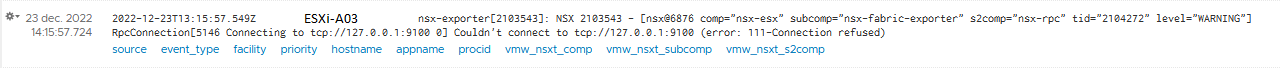 So, back to vRLI to see if there is a more explaining error to find, after filtering on NSX, the graph showed considerably more log entries from roughly 14.15 onwards. The log shown below popped out to me. […] Couldn’t connect to tcp://127.0.0.1:9100 (error: 111-Connection refused)