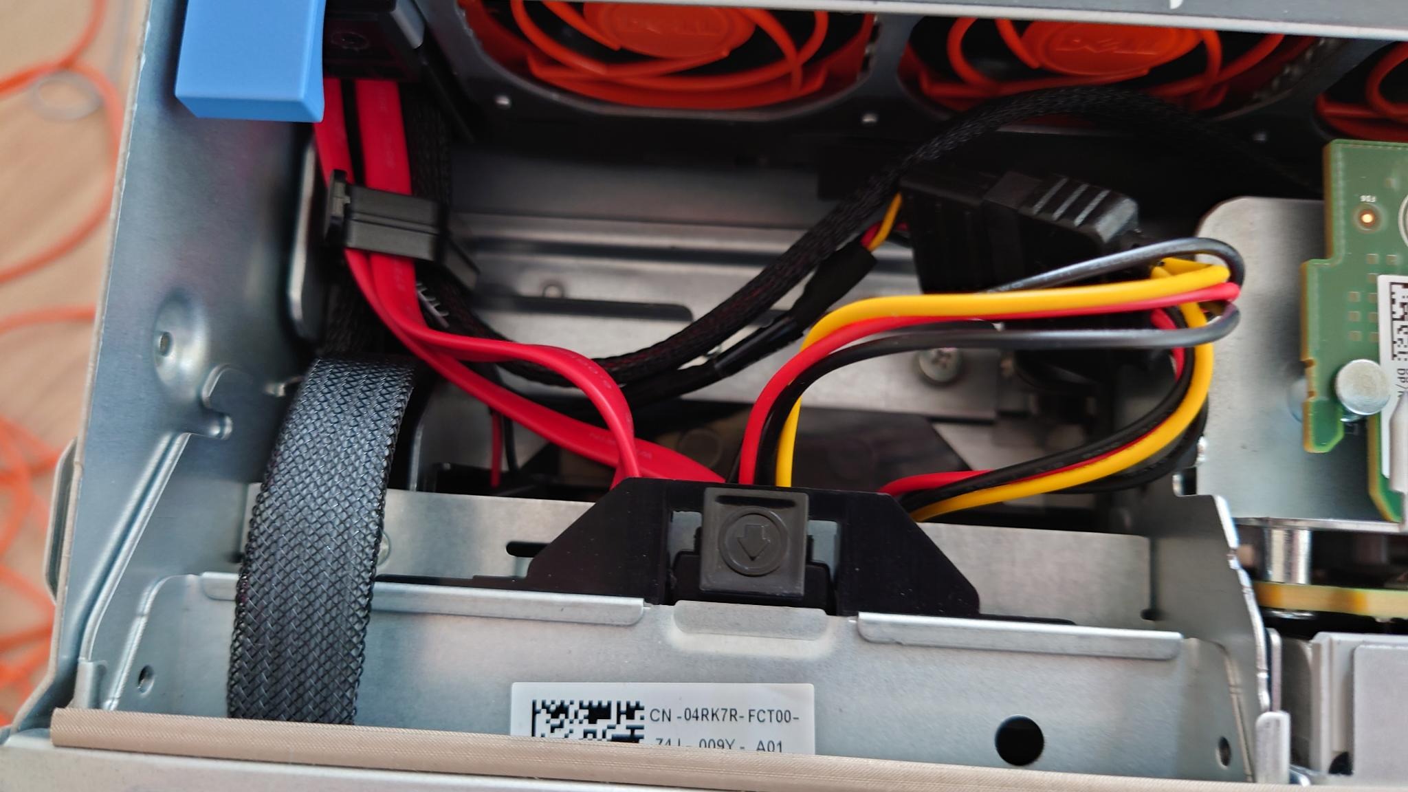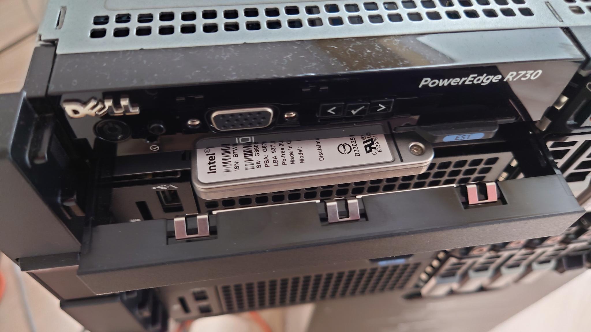 Since I don’t want to use the SD cards in the servers, I need a different place to install ESXi. The ESXi installation footprint is quite small, so I don’t want to use an expensive, high-capacity, SSD for that. Also, I’d like to keep the drive bays in the front of the server available. I ended up molesting the CD drive bay filler from Dell to allow for the data and power cable to fit through. Then a 480GB SDD fits in there nice and snug. This 480GB SDD is plenty to hold the ESXi installation, and it’s an Intel DC SDD which -hopefully- won’t fail on me that quickly (or rather at all).