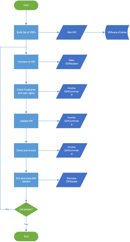 Also, important is that the script needs to be dynamic- I don’t want to feed in a static list of VM’s to update and find out after a couple of months that I missed VM’s. The script must therefore build a list with Debian VM’s that are powered on in VMware vCenter and install the updates on those VMs. The script will use that list of VMs to connect to every VM via SSH and install all the relevant updates similar to the command I would normally put when I log in. The script will now update one VM at a time but as a future improvement, I’d like to make it process the VM updates in parallel to be more efficient. With all these steps in mind, I decided it’s easier to create a flowchart with all that the script needs to do and which commands I need as you can find below.