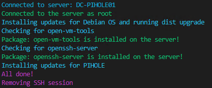 Now with the VM up-to-date and all the extra packages installed the script could be done. Sadly I found that not all packages are updated. In a previous post, I mentioned that I have a Pi-hole running but it’s not possible to update Pi-hole with the apt-get -y update command because it just works differently. Therefore, the script will check the hostname of the VM it’s connected to and if this is equal to ‘DC-PIHOLE01’ it will also run the needed command ‘pihole -up‘ to update Pi-hole.